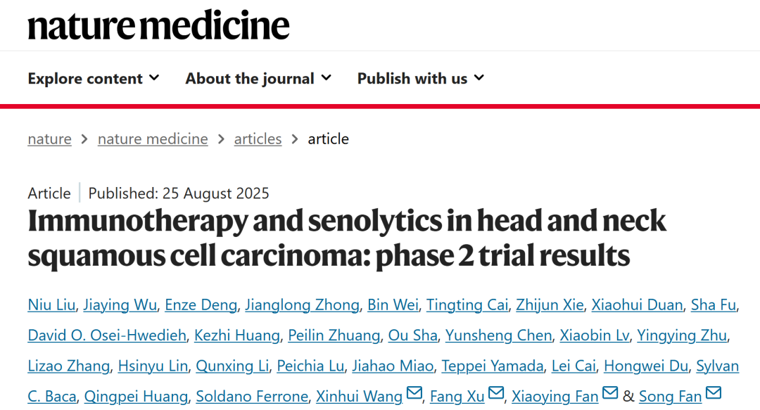 中國科學(xué)院深圳先進(jìn)技術(shù)研究院(以下簡稱“深圳先進(jìn)院”)腦認(rèn)知與腦疾病研究所(以下簡稱“腦所”)徐放副研究員,與中山大學(xué)孫逸仙紀(jì)念醫(yī)院范松主任醫(yī)師、廣州國家實驗室范小英研究員、哈佛大學(xué)醫(yī)學(xué)院Xinhui Wang教授合作,在Nature Medicine在線發(fā)表了論文Immunotherapy and senolytics in head and neck squamous cell carcinoma: phase 2 trial results,首次證實腫瘤微環(huán)境中的免疫衰老是導(dǎo)致免疫治療耐藥的關(guān)鍵因素,并通過動物模型和全球首個Ⅱ期臨床試驗證實抗衰老藥物聯(lián)合免疫治療顯著提升頭頸鱗狀細(xì)胞癌(HNSCC)患者治療響應(yīng)率,且大幅降低毒副作用。該研究為實體瘤免疫治療提供了突破性策略。