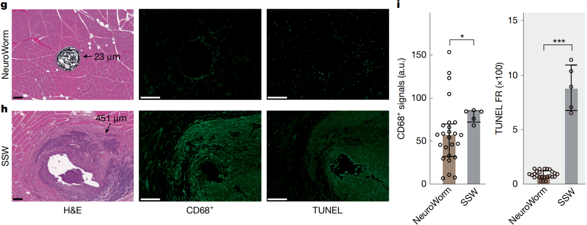 團隊利用微創(chuàng)植入技術(shù),成功實現(xiàn)了NeuroWorm電極在大鼠腿部肌肉內(nèi)穩(wěn)定工作超過43周。值得關(guān)注的是,電極植入13個月后,其周圍形成的纖維包裹層厚度平均不足23微米,周圍組織的細胞凋亡率與正常組織相當,展現(xiàn)了優(yōu)異的長期生物相容性。相比之下,傳統(tǒng)不銹鋼絲電極在相同條件下包裹層厚度超過451微米,伴隨顯著的細胞凋亡反應。