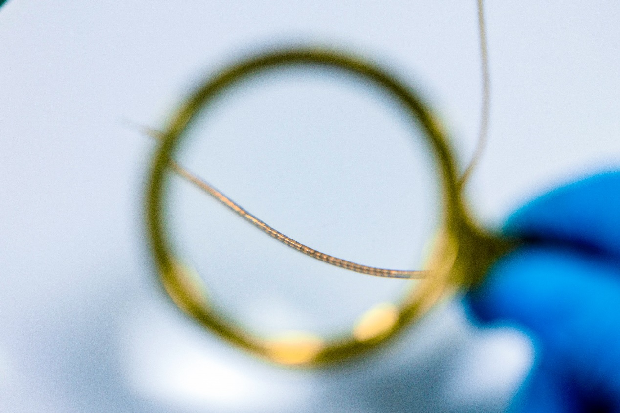 在該研究中,研究團隊首先要解決的難題,便是如何在一根直徑約為200微米的纖維上,布局數(shù)十個獨立的電極通道,這相當于在一根頭發(fā)絲上拆分雕刻出數(shù)十根長度一致、彼此不能交叉的細線,還要保證這根纖維足夠柔軟且可拉伸。