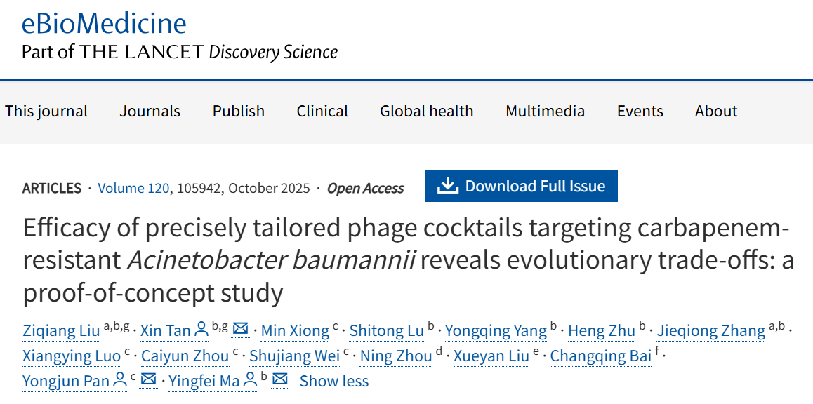 9月18日,中國科學院深圳先進技術研究院定量合成生物學全國重點實驗室、合成生物學研究所合成微生物組學研究中心馬迎飛團隊,聯合南方科技大學醫(yī)院重癥醫(yī)學科潘勇軍團隊、深圳大學總醫(yī)院呼吸科柏長青團隊以及深圳市人民醫(yī)院重癥醫(yī)學科劉雪燕團隊,在《柳葉刀》旗下轉化醫(yī)學領域重要期刊eBioMedicine(醫(yī)學1區(qū),IF=10.8)上發(fā)表了一項題為“Efficacy of Precisely Tailored Phage Cocktails Targeting Carbapenem-Resistant Acinetobacter baumannii Reveals Evolutionary Trade-offs: a proof-of-concept study”的研究論文。