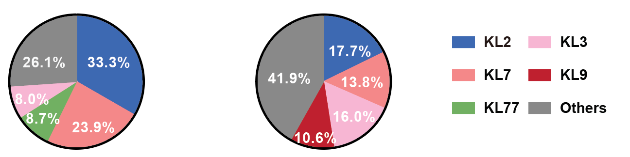 研究團隊從深圳、廣州及中山等地的多家醫(yī)院共采集138株臨床分離CRAB,其中莢膜2型(KL2)菌株占比最高,為33.3%。同時,結合兩項全國流行病學研究的896株菌株基因組分析發(fā)現,KL2型在全國范圍內的占比仍高達17.7%(圖1)。這提示KL2型CRAB不僅在廣東高發(fā),且已在全國范圍內廣泛流行。