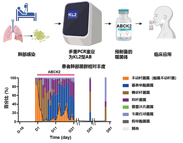 在后續(xù)臨床應用中,研究團隊使用ABCK2成功清除了兩例患者肺部感染的KL2型鮑曼不動桿菌,展現出良好的治療效果。該研究不僅驗證了基于流行菌株分型精準設計固定配方噬菌體雞尾酒的可行性與有效性,也為理解噬菌體-宿主共進化關系提供了關鍵證據。成功的臨床案例突顯了ABCK2在治療多重耐藥菌感染中的應用潛力,為推進下一代噬菌體療法的臨床轉化奠定了重要基礎。