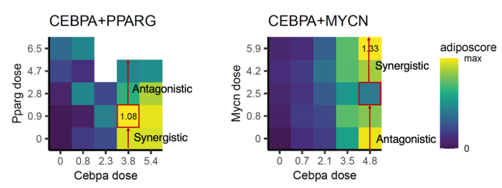 在組合擾動實驗中,研究者發(fā)現(xiàn)不同轉(zhuǎn)錄因子的相互作用不僅取決于基因組合本身,還強烈依賴于基因劑量。同一對轉(zhuǎn)錄因子組合在不同劑量下可表現(xiàn)為可逆轉(zhuǎn)的協(xié)同或拮抗作用,且這種效應(yīng)具有基因特異性,進一步凸顯了基因網(wǎng)絡(luò)調(diào)控的復雜性。