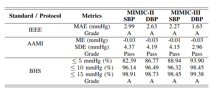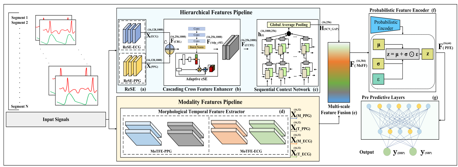 在研究中,團隊提出了一種全新的多模態(tài)融合網(wǎng)絡模型MuFuBP-Net,用于基于 ECG 與 PPG 的無袖帶血壓估計。模型采用雙特征提取通道架構,分別進行分層與模態(tài)特征建模;引入 Cascading Cross-Feature Enhancer(CCFE) 跨模態(tài)融合與通道注意機制,動態(tài)調(diào)節(jié)時空特征的重要性;基于變分思想設計 Probabilistic Feature Encoder(PFE),對高維融合特征進行緊湊建模與去冗,從而提升泛化能力與魯棒性。在 MIMIC-II 與 MIMIC-III 數(shù)據(jù)庫上,所提出的模型在收縮壓(SBP)評估中達到MAE ± SDE ≤ 2.99 ± 4.37 mmHg,舒張壓(DBP)評估中達到MAE ± SDE ≤ 2.63 ± 4.19 mmHg ,結果優(yōu)于國內(nèi)外同類模型,并符合 AAMI、BHS、IEEE 三大國際標準的 A 級要求。研究同時引入 LIME 可解釋性分析,驗證 ECG 在血壓預測中的關鍵作用,并通過多組消融實驗進一步確證模型設計的有效性與創(chuàng)新性。
