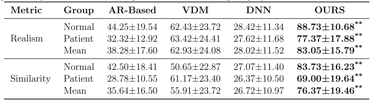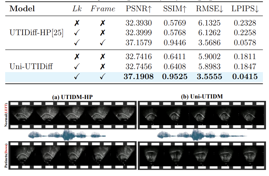 實(shí)驗(yàn)結(jié)果表明,Uni-UTIDiff 不僅在統(tǒng)一框架下能夠分別達(dá)到針對(duì)健康與病理語(yǔ)音的專家模型性能水平,還能在生成的舌超聲圖像中展現(xiàn)出優(yōu)異的清晰度與自然度,充分驗(yàn)證了其在跨發(fā)音模式下的魯棒生成能力。