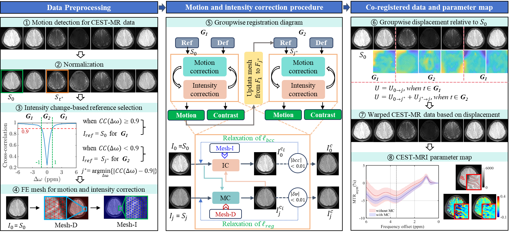 研究團隊在有限元數(shù)字圖像相關(guān)(FE-DIC)基礎(chǔ)上,構(gòu)建了面向 CEST-MRI 的交替式運動-強度聯(lián)合校正框架(圖1)。一方面,通過力學(xué)正則化在有限元網(wǎng)格上估計時空連續(xù)、組織一致的位移場;另一方面,在每輪運動校正后自適應(yīng)更新全局亮度和對比度,以補償頻率依賴性的強度變化。二者以迭代交替的方式緊密耦合,使運動估計不再受強度變化干擾、強度校正也不再受到殘余運動限制,從而實現(xiàn)了對 CEST-MRI 動態(tài)序列的協(xié)同優(yōu)化配準。
