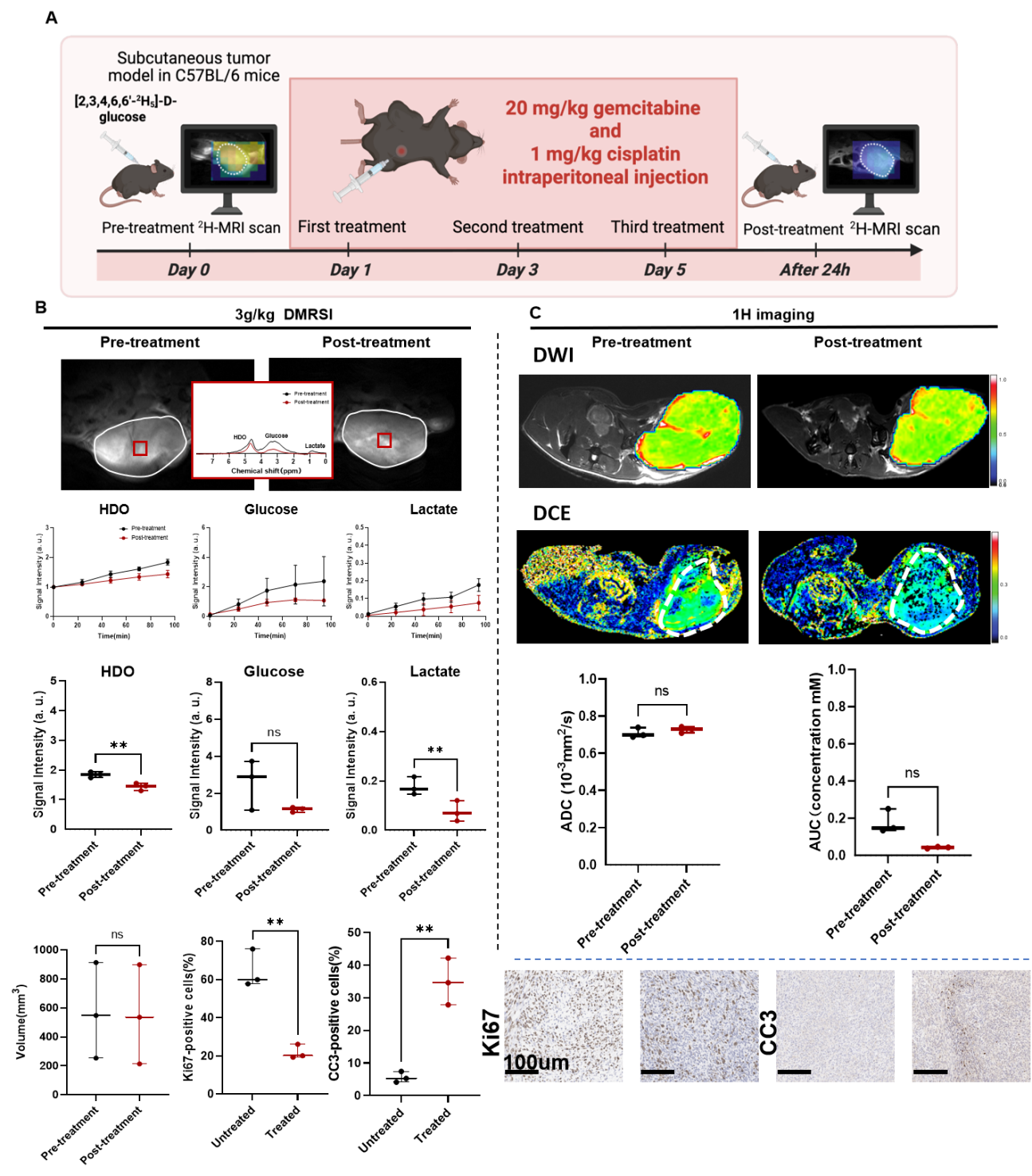 在膀胱癌的小鼠模型中,研究團(tuán)隊(duì)發(fā)現(xiàn),DMRSI能夠在化療后僅 24 小時(shí)就捕捉到腫瘤代謝的明顯變化:乳酸相關(guān)信號(hào)下降了 55%–80%,說明了腫瘤在經(jīng)過化療后糖酵解代謝活動(dòng)被顯著抑制。相比之下,此時(shí)常規(guī) MRI 檢查(如彌散加權(quán)成像DWI與動(dòng)態(tài)增強(qiáng)成像DCE)看不出明顯差別。進(jìn)一步的組織學(xué)分析顯示,這些代謝變化與腫瘤增殖下降、細(xì)胞凋亡增加等關(guān)鍵指標(biāo)高度一致。這表明,DMRSI能更早反映治療效果,有望為腫瘤療效評(píng)估提供更及時(shí)、更直觀的影像依據(jù)。
