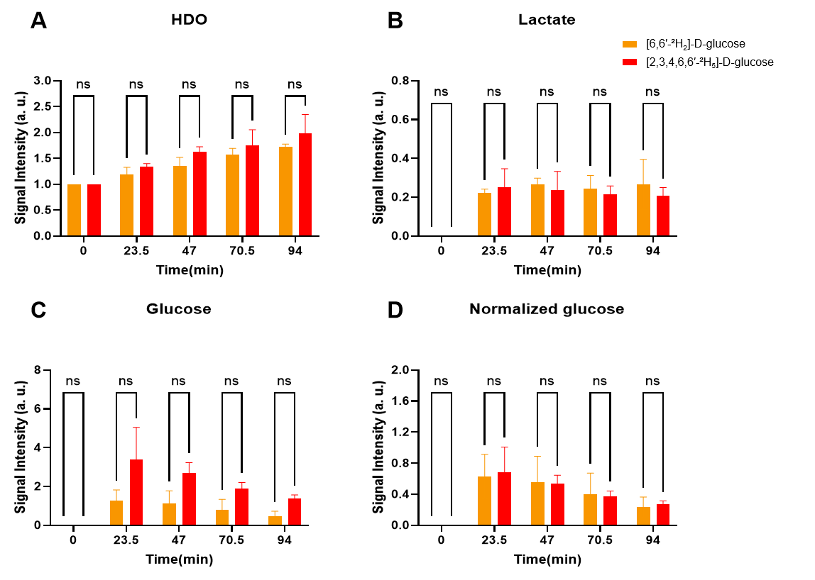 通過體尾靜脈注射實(shí)驗(yàn),研究團(tuán)隊(duì)還對(duì)[6,6′-2H?]-D-葡萄糖與[2,3,4,6,6′-2H?]-D-葡萄糖兩種探針進(jìn)行了對(duì)比。實(shí)驗(yàn)結(jié)果表明,[2,3,4,6,6′-2H?]-D-葡萄糖在維持原有代謝路徑不變的基礎(chǔ)下,提供了更高的葡萄糖信噪比,同時(shí)產(chǎn)生了更強(qiáng)的氘標(biāo)記水檢測(cè)信號(hào)。值得關(guān)注的是,該探針在合成成本方面相比傳統(tǒng)探針降低了近一個(gè)數(shù)量級(jí),這一重要突破為解決臨床推廣應(yīng)用中的成本瓶頸問題提供了切實(shí)可行的方案。