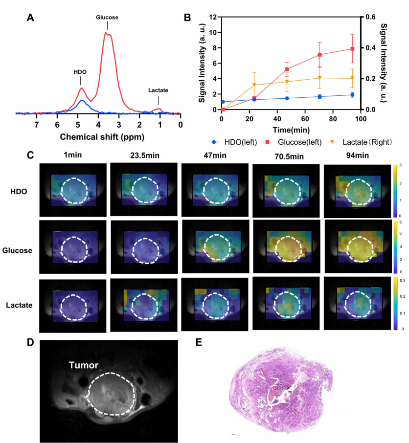 DMRSI是一項(xiàng)利用氘標(biāo)記底物追蹤體內(nèi)代謝動(dòng)態(tài)的磁共振新技術(shù)。你可以把它想象成一個(gè)“代謝雷達(dá)”——實(shí)時(shí)監(jiān)測(cè)氘標(biāo)記底物(如氘標(biāo)記葡萄糖)在體內(nèi)向關(guān)鍵代謝產(chǎn)物(如乳酸等)的轉(zhuǎn)化過程,從而直接反映組織內(nèi)部的代謝活躍程度。值得一提的是,DMRSI能夠在完全無電離輻射的前提下獲取高特異性的代謝信息。