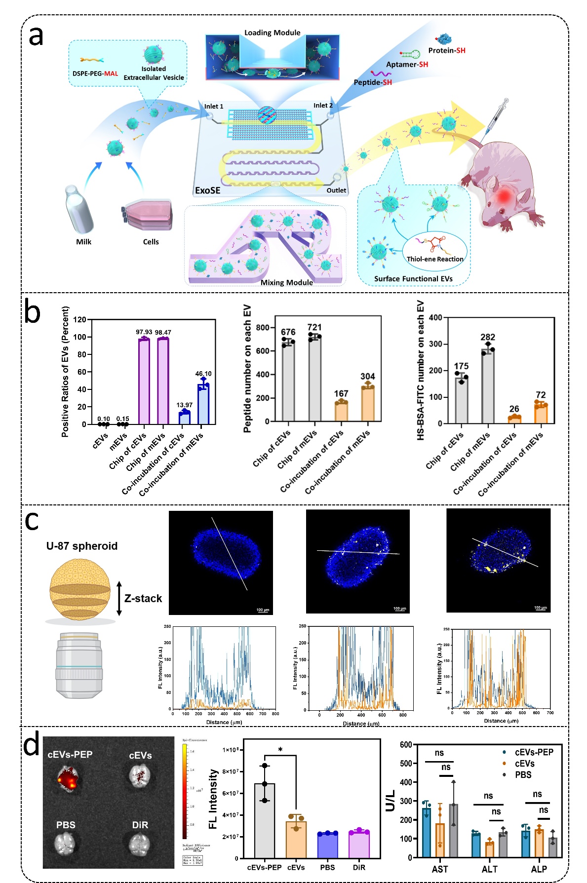 為破解這一瓶頸,中國科學院深圳先進技術(shù)研究院醫(yī)學成像科學與技術(shù)系統(tǒng)全國重點實驗室、醫(yī)工所傳感中心楊慧研究員團隊,突破傳統(tǒng)技術(shù)局限,成功研發(fā)出名為ExoSE(EV Surface-Engineering device)的通用微納流控平臺,可高效、標準化地完成sEV表面工程化改造,顯著提升其靶向能力。相關研究"Universal Microfluidic Platform for Multifunctional Surface Modification of Small Extracellular Vesicles"近期發(fā)表于國際細胞外囊泡研究頂級期刊Journal of Extracellular Vesicles。