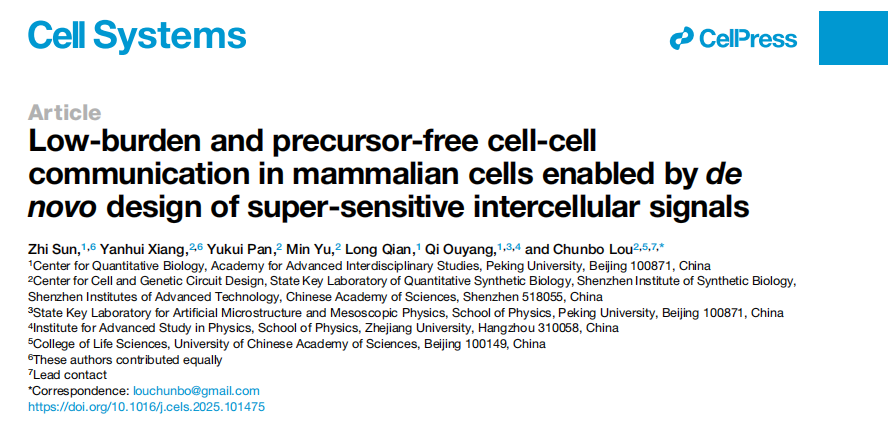 為了解決這些難題,12月17日,中國科學(xué)院深圳先進(jìn)技術(shù)研究院婁春波團(tuán)隊(duì)聯(lián)合北京大學(xué)合作者,在國際學(xué)術(shù)期刊Cell Systems上以封面文章形式在線發(fā)表題為"Low-burden and precursor-free cell-cell communication in mammalian cells enabled by de novo design of super-sensitive intercellular signals"的研究論文,報(bào)道了首個(gè)具有超靈敏響應(yīng)(super-sensitivity)、底盤友好型(low-burden)等優(yōu)異特性的哺乳動(dòng)物細(xì)胞間通訊的小分子信號(hào)系統(tǒng),并進(jìn)一步驗(yàn)證了該系統(tǒng)用于指導(dǎo)多細(xì)胞系統(tǒng)進(jìn)行更復(fù)雜空間組織的底層能力。