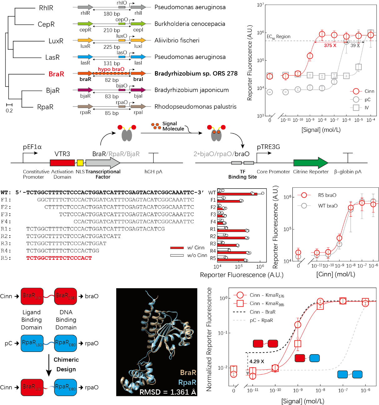 本研究首先構(gòu)建并優(yōu)化了Cinn接收模塊。實(shí)驗(yàn)結(jié)果顯示,該模塊的半最大效應(yīng)濃度(EC50)低至約10-9 mol/L,其靈敏度比現(xiàn)有報(bào)道的最優(yōu)哺乳動(dòng)物細(xì)胞通訊信號(hào)系統(tǒng)提升了約375倍。為了進(jìn)一步提升性能,研究團(tuán)隊(duì)界定了BraR的最小核心結(jié)合序列,將其從46 bp精簡至18 bp,有效降低了潛在的非特異性結(jié)合風(fēng)險(xiǎn)。此外,針對(duì)受體本底泄漏較高的問題,團(tuán)隊(duì)利用AlphaFold2進(jìn)行結(jié)構(gòu)預(yù)測,采用嵌合工程策略將BraR的配體結(jié)合域(LBD)與同源蛋白R(shí)paR的DNA結(jié)合域(DBD)融合,成功開發(fā)出新型受體KmaR。該受體在保持超高靈敏度的同時(shí)顯著抑制了本底活性,實(shí)現(xiàn)了信號(hào)識(shí)別精度與動(dòng)態(tài)響應(yīng)范圍的協(xié)同優(yōu)化。