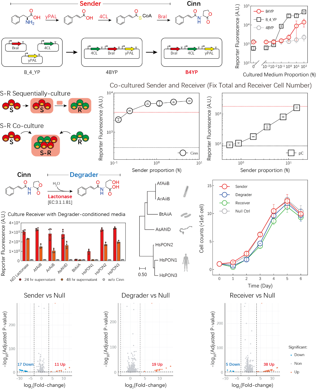在發(fā)送模塊方面,本研究設(shè)計(jì)了包含三種酶的代謝通路,以細(xì)胞內(nèi)廣泛存在的苯丙氨酸為底物,實(shí)現(xiàn)了無需外源前體(Precursor-free)的Cinn自主從頭合成。通過對(duì)基因表達(dá)盒排布的優(yōu)化,該模塊克服了轉(zhuǎn)錄干擾,實(shí)現(xiàn)了Cinn分子的穩(wěn)定高效產(chǎn)出。共培養(yǎng)實(shí)驗(yàn)證實(shí),得益于系統(tǒng)的高靈敏度,僅需極低比例的發(fā)送細(xì)胞即可有效激活接收細(xì)胞,建立了穩(wěn)健的胞間通訊。為調(diào)控信號(hào)的時(shí)空動(dòng)態(tài),系統(tǒng)引入了高效的內(nèi)酯酶降解模塊,防止信號(hào)累積導(dǎo)致的飽和與干擾。此外,基于細(xì)胞生長動(dòng)力學(xué)與轉(zhuǎn)錄組學(xué)的評(píng)估表明,搭載各功能模塊的工程化細(xì)胞與野生型無顯著差異,證實(shí)了該系統(tǒng)具有卓越的底盤兼容性與低負(fù)擔(dān)特性。