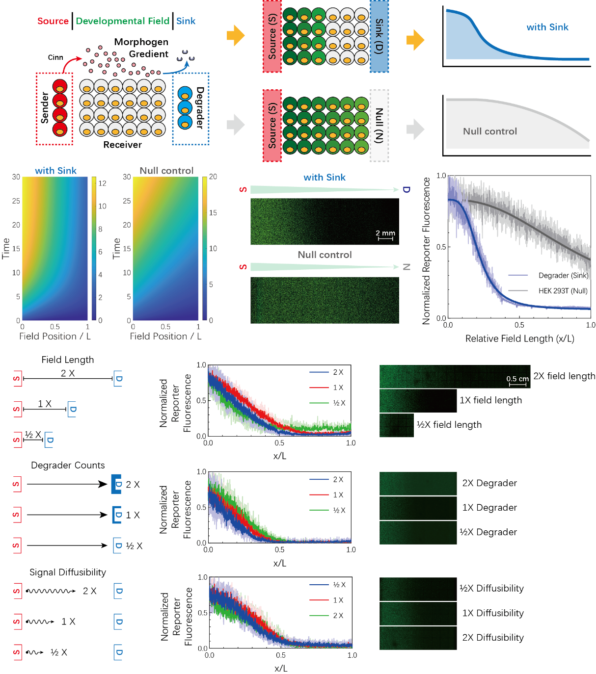 利用這套全新的工具,研究團(tuán)隊(duì)模擬了生物發(fā)育中的經(jīng)典“源-匯(Source-Sink)”空間梯度斑圖模型。他們構(gòu)建了三種細(xì)胞:產(chǎn)生信號(hào)的“源(Sender)”細(xì)胞、降解信號(hào)的“匯(Degrader)”細(xì)胞,以及感知信號(hào)的“接收(Receiver)”細(xì)胞。實(shí)驗(yàn)結(jié)果令人振奮:當(dāng)“源”和“匯”分別位于空間兩端時(shí),中間區(qū)域形成了一個(gè)梯度陡峭且位置穩(wěn)定的信號(hào)響應(yīng)梯度。