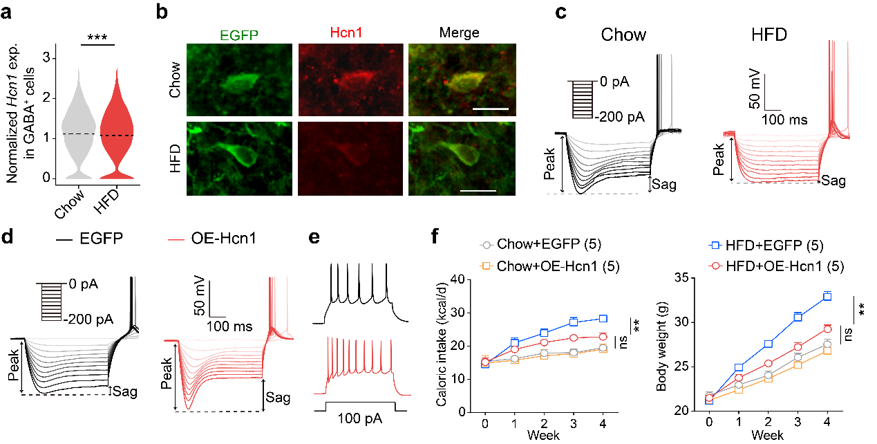 圖2. Hcn1通過調(diào)節(jié)LSGABA神經(jīng)元興奮性干預(yù)高脂飲食引發(fā)的肥胖進(jìn)程
