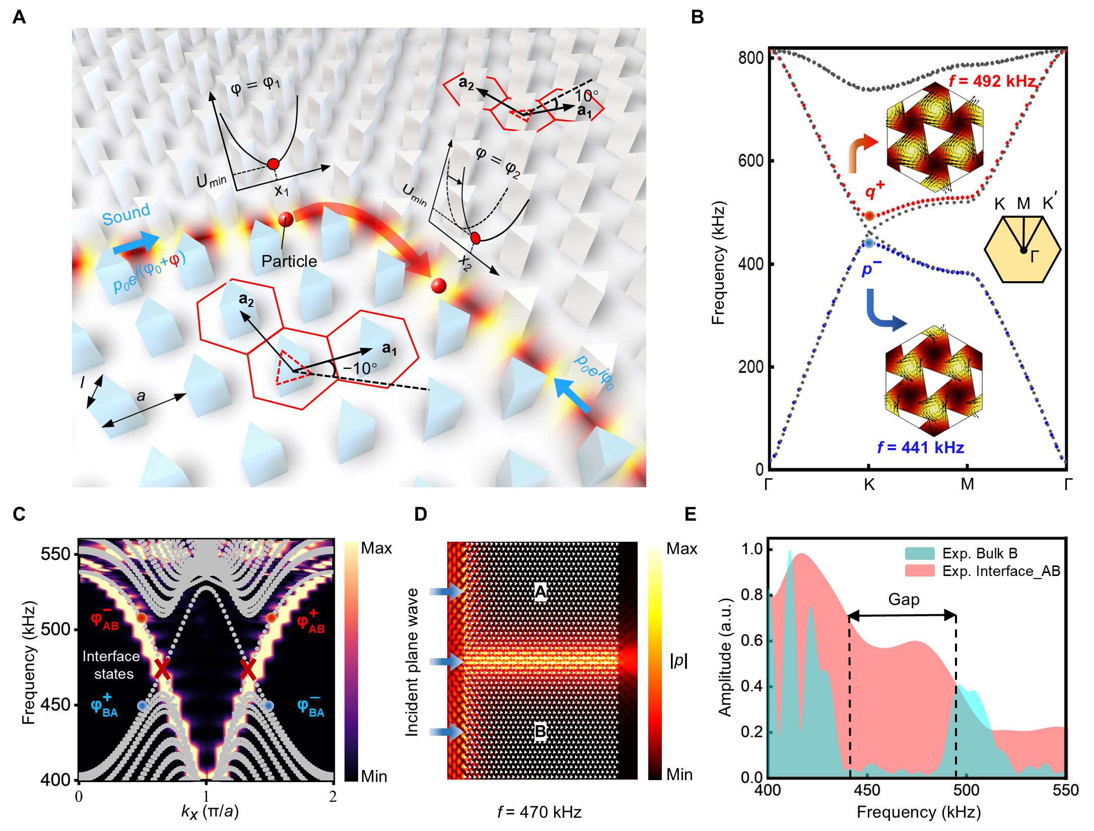 圖1:?拓?fù)渎晫W(xué)質(zhì)量輸運(yùn)。(A)?利用谷霍爾拓?fù)浣^緣體實(shí)現(xiàn)顆粒輸運(yùn)示意圖。(B)?元胞能帶結(jié)構(gòu)。插圖為兩種谷態(tài)(q?和p?)的模擬本征場(chǎng)分布。(C)?超胞能帶結(jié)構(gòu)及通過傅里葉變換得到的相應(yīng)頻譜。(D)?在470 kHz頻率下,谷霍爾拓?fù)浣^緣體中的仿真聲壓場(chǎng)分布,平面波從左邊界入射。(E)?晶格B和晶格A-B界面的實(shí)驗(yàn)測(cè)量透射譜。在帶隙范圍內(nèi)(如黑色虛線標(biāo)注)可觀察到明顯的拓?fù)洳▊鬏敗?/span>