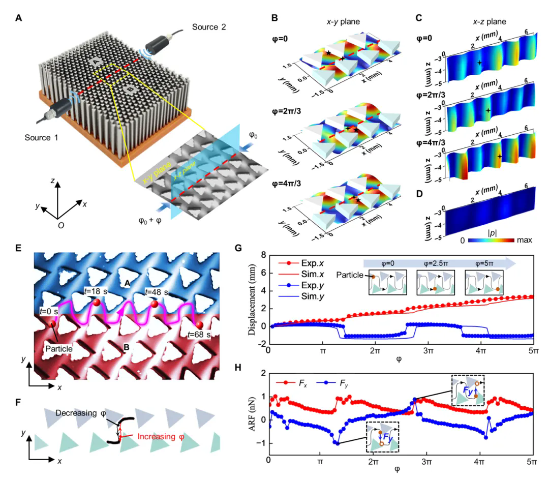 圖2: 直線型拓?fù)洳▽?dǎo)中的駐波與質(zhì)量輸運(yùn)。(A) 實(shí)驗(yàn)樣品及駐波激勵(lì)示意圖。插圖標(biāo)明了晶格A-B界面(x-z平面)與顆粒操控觀測(cè)平面(x-y平面),紅色虛線標(biāo)示x-y平面中晶格A與B的分界處。(B) 和 (C) 不同相位差條件下x-y平面的模擬聲壓場(chǎng)與x-z平面的實(shí)測(cè)聲壓場(chǎng)。其中z軸原點(diǎn)位于柱體上表面。(D) 距A-B界面四個(gè)晶格常數(shù)距離處的x-z平面聲壓場(chǎng)分布。(E) PDMS顆粒在拓?fù)渫ǖ乐械妮斶\(yùn)。(F) 相位差φ遞增與遞減時(shí)顆粒往返仿真運(yùn)動(dòng)軌跡。(G) 顆粒位移隨φ的變化關(guān)系。插圖標(biāo)注了φ=0,2.5π,5π時(shí)的顆粒位置(從左至右)。(H) x與y方向聲輻射力隨φ的變化關(guān)系。插圖標(biāo)注當(dāng)Fy達(dá)到峰值時(shí)顆粒的位置(實(shí)心圓)及下一時(shí)刻位置(空心圓)