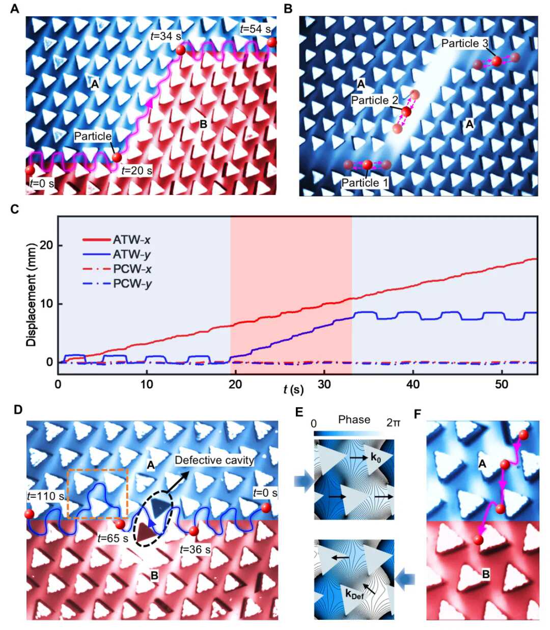 圖3:聲學(xué)拓?fù)洳▽?dǎo)(ATW)中的聲微流控技術(shù)。(A) 帶有拐角缺陷的ATW中的穩(wěn)健顆粒輸運(yùn)。(B) 聲子晶體波導(dǎo)(PCW)中的顆粒運(yùn)動(dòng)。(C) ATW和PCW中顆粒(PCW以圖B中顆粒1為例)沿x和y方向的位移。(D) 帶有空腔缺陷的ATW中的顆粒輸運(yùn)。(E) 聲波分別從結(jié)構(gòu)兩側(cè)入射時(shí),圖D橙色矩形標(biāo)注區(qū)域聲場(chǎng)的相位云圖及等高線圖。(F) 聲輻射力將ATW界面外的PDMS顆粒吸引至界面
