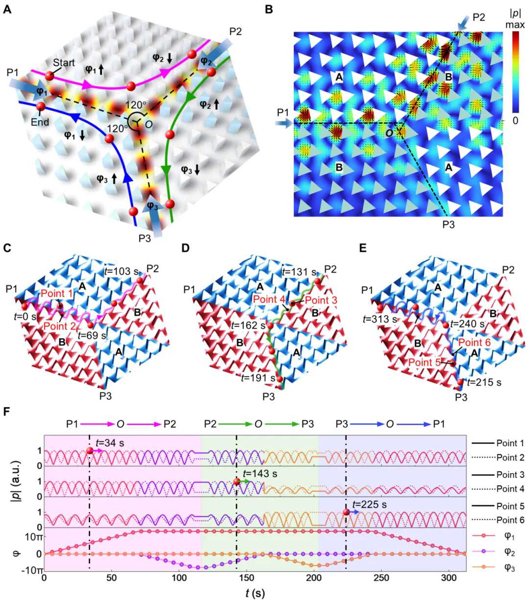 圖4:拓?fù)滟|(zhì)量循環(huán)。(A) 拓?fù)渎晫W(xué)循環(huán)器示意圖。(B) 聲波從端口P1和P2入射時(shí)的仿真聲壓場(chǎng)分布。黑色箭頭描繪了聲輻射力的方向。(C)至(E)分別展示從端口P1到P2、從P2到P3、從P3到P1質(zhì)量輸運(yùn)的實(shí)驗(yàn)結(jié)果。(F) 三個(gè)端口處聲源相位的時(shí)序變化,以及在(C)至(E)中標(biāo)記的六個(gè)點(diǎn)處計(jì)算得到的聲壓幅值