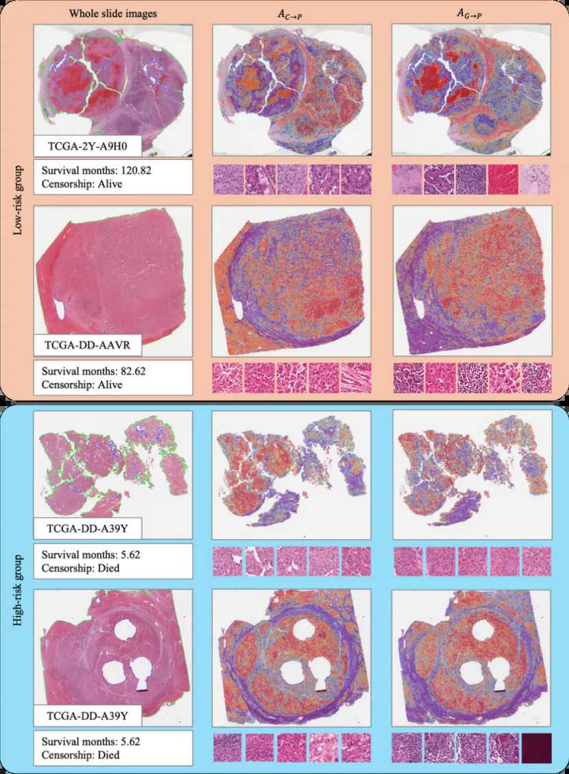 為進(jìn)一步分析雙路徑融合嵌入對(duì)模型決策的貢獻(xiàn),研究采用Integrated Gradients(IG)方法量化多模態(tài)嵌入對(duì)預(yù)測(cè)結(jié)果的影響,并對(duì)跨模態(tài)注意力矩陣Ac→p(臨床-病理學(xué))和Ag→p(基因組-病理學(xué))在病理全切片圖像上的分布進(jìn)行了可視化,以研究基因組和臨床信息關(guān)注的組織區(qū)域。圖4展示了來自數(shù)據(jù)集TCGA-LIHC的典型病例,其中紅色表示高關(guān)注區(qū)域,藍(lán)色表示低關(guān)注區(qū)域。根據(jù)生存時(shí)間將病例分為高風(fēng)險(xiǎn)和低風(fēng)險(xiǎn)組,生存時(shí)間越短,風(fēng)險(xiǎn)越高。本研究分別根據(jù)Ac→p和Ag→p的累積注意力值選擇了排名前50的圖像塊區(qū)域。在TCGA-LIHC中(圖4),臨床和基因組數(shù)據(jù)的注意力主要集中在WSI中的腫瘤細(xì)胞區(qū)域。此外,基因組數(shù)據(jù)還更傾向于關(guān)注諸如淋巴細(xì)胞和壞死等區(qū)域,而這些區(qū)域很少被Ac→p選擇。然而,基因組數(shù)據(jù)更容易受到噪聲的影響,并可能聚焦于無關(guān)的偽影,如臨床上的人工馬克筆標(biāo)記或掃描陰影。盡管不同數(shù)據(jù)集中的臨床和基因組數(shù)據(jù)的主要關(guān)注區(qū)域有所不同,但總體而言它們是互補(bǔ)的。