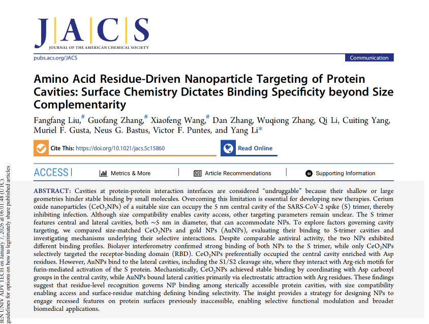 近日,中國(guó)科學(xué)院深圳先進(jìn)技術(shù)研究院醫(yī)藥所炎癥與疫苗研究室李洋團(tuán)隊(duì)以Amino Acid Residue-Driven Nanoparticle Targeting of Protein Cavities: Surface Chemistry Dictates Binding Specificity beyond Size Complementarity為題,在 Journal of the American Chemical Society發(fā)表研究成果,系統(tǒng)揭示了納米材料靶向蛋白表面腔體的分子識(shí)別機(jī)制。