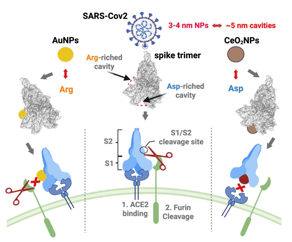 本研究以 SARS-CoV-2 刺突蛋白(Spike,S 蛋白)為模型體系,選取尺寸高度一致但表面化學(xué)性質(zhì)不同的CeO?NPs和金納米顆粒(AuNPs),在嚴(yán)格控制尺寸變量的前提下,系統(tǒng)比較了納米材料表面化學(xué)性質(zhì)對(duì)蛋白腔體靶向行為的影響。結(jié)果顯示,兩類(lèi)納米顆粒均可通過(guò)與刺突蛋白結(jié)合發(fā)揮抗病毒作用,但其結(jié)合位點(diǎn)和分子機(jī)制存在顯著差異。CeO?NPs傾向于靶向富含天冬氨酸(Asp)殘基的中央腔體,通過(guò)與 Asp 羧基之間的配位作用實(shí)現(xiàn)穩(wěn)定結(jié)合,從而阻斷S蛋白與宿主細(xì)胞ACE2受體的識(shí)別過(guò)程。而AuNPs主要結(jié)合富含精氨酸(Arg)殘基的側(cè)向腔體,依賴與Arg的靜電作用和氫鍵相互作用,靠近S1/S2 酶切位點(diǎn)區(qū)域,干擾宿主蛋白酶介導(dǎo)的刺突蛋白激活過(guò)程。