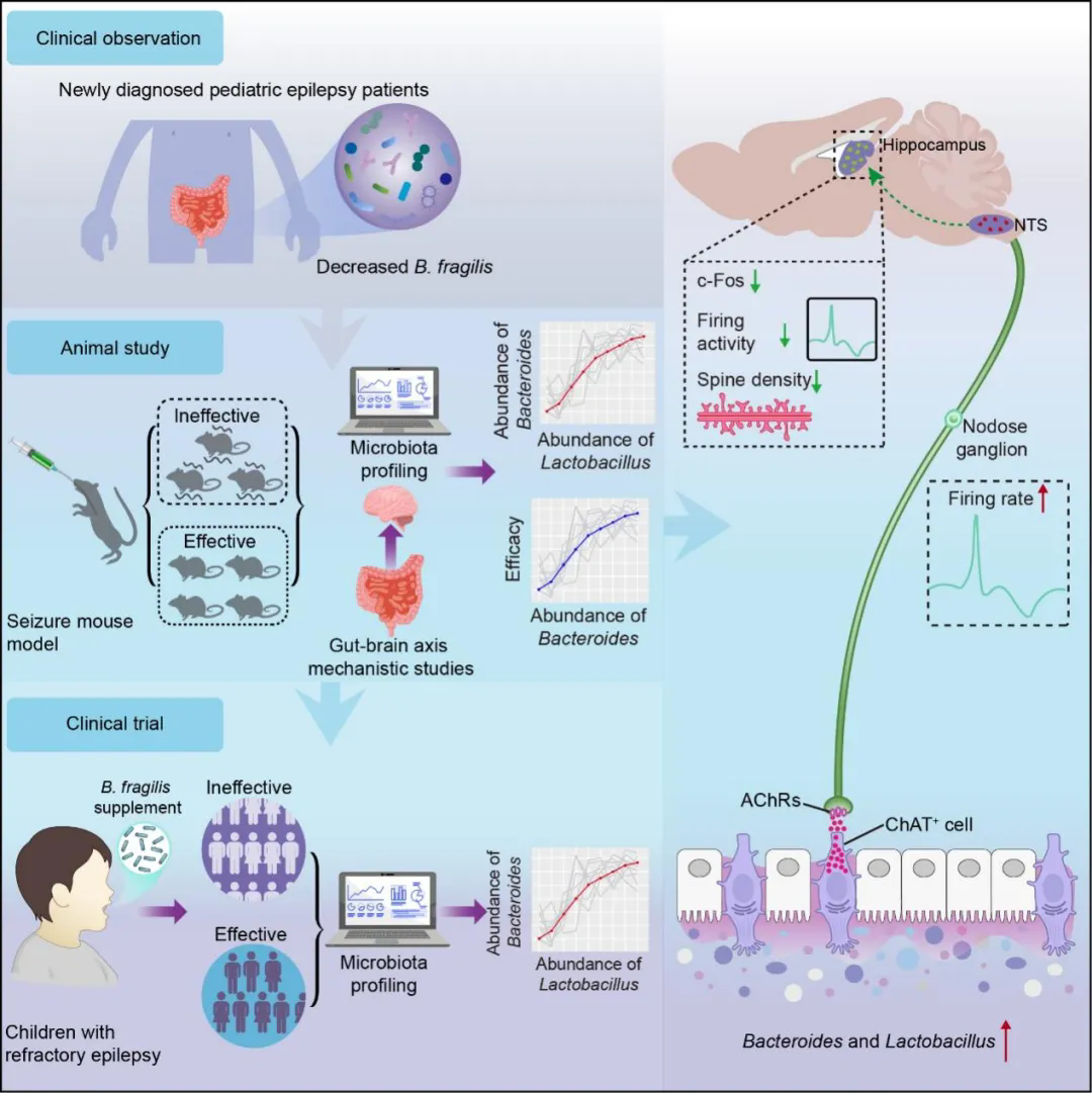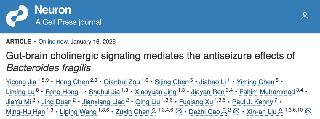 1月16日,中國科學(xué)院深圳先進(jìn)技術(shù)研究院腦認(rèn)知與腦疾病研究所(簡稱“腦所”)/深港腦科學(xué)創(chuàng)新研究院(簡稱“深港腦院”)劉欣安副研究員與陳祖昕副研究員團(tuán)隊(duì),聯(lián)合深圳市兒童醫(yī)院操德智主任,在國際神經(jīng)科學(xué)權(quán)威期刊Neuron在線發(fā)表題為"Gut-Brain Cholinergic Signaling Mediates the Antiseizure Effects of Bacteroides fragilis"的研究論文。該研究從兒童癲癇臨床菌群特征出發(fā),揭示了一個(gè)由特定益生菌激活的全新膽堿能腸–腦神經(jīng)環(huán)路,闡明了益生菌如何經(jīng)迷走神經(jīng)遠(yuǎn)程調(diào)控大腦興奮性的機(jī)制,并在臨床研究中得到療效驗(yàn)證,也為難治性癲癇提供了一種安全、精準(zhǔn)、可轉(zhuǎn)化的干預(yù)新策略。
