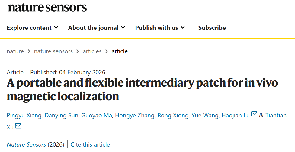 2月4日,中國科學(xué)院深圳先進(jìn)技術(shù)研究院徐天添研究員與浙江大學(xué)陸豪健研究員團(tuán)隊提出了一種可貼附、可定制的柔性磁定位貼片系統(tǒng),并在此基礎(chǔ)上構(gòu)建了一種雙階段磁定位框架。該研究以《A Portable and Flexible Intermediary Patch for in vivo Magnetic Localization》為題,發(fā)表在知名學(xué)術(shù)期刊《Nature》(《自然》)旗下專注于傳感器研究領(lǐng)域的子刊《Nature Sensors》(《自然·傳感器》)上。浙江大學(xué)控制學(xué)院博士生向平宇,碩士生孫丹穎,中國科學(xué)院深圳先進(jìn)技術(shù)研究院博士生馬國耀為共同第一作者,徐天添研究員和陸豪健研究員為共同通訊作者。