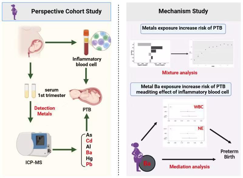 早產(chǎn)作為全球重大公共衛(wèi)生問(wèn)題,指妊娠37周之前出生的活嬰兒,其不僅是5歲以下兒童死亡的主要危險(xiǎn)因素,還會(huì)使早產(chǎn)兒面臨呼吸疾病、慢性病癥、神經(jīng)系統(tǒng)障礙等長(zhǎng)期健康風(fēng)險(xiǎn)。監(jiān)測(cè)數(shù)據(jù)顯示,2012-2018年早產(chǎn)發(fā)生率年均上升1.3%,2020年全國(guó)早產(chǎn)病例達(dá)75.29萬(wàn)例,占活產(chǎn)數(shù)的6.1%。隨著工業(yè)化與城市化發(fā)展,環(huán)境金屬污染成為新興健康威脅,已有研究發(fā)現(xiàn)金屬暴露與早產(chǎn)存在關(guān)聯(lián),但二者間的潛在作用機(jī)制尚未明確,孕早期金屬暴露如何導(dǎo)致早產(chǎn)的發(fā)生,成為亟待闡明的關(guān)鍵科學(xué)問(wèn)題。