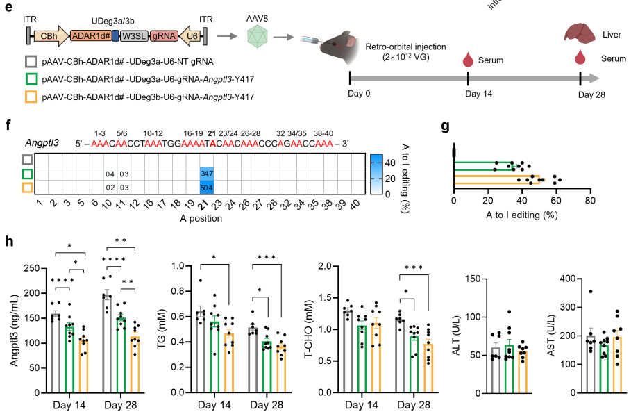 在基因治療轉(zhuǎn)化應(yīng)用層面,RECODE系統(tǒng)展現(xiàn)了強(qiáng)大的治療潛力。研究團(tuán)隊(duì)成功利用其在小鼠中高效糾正了與肌萎縮側(cè)索硬化癥(Amyotrophic Lateral Sclerosis,ALS)相關(guān)的FUS基因突變(圖2),有效逆轉(zhuǎn)了突變導(dǎo)致的FUS蛋白在神經(jīng)元軸突中的錯(cuò)誤定位。此外,RECODE還成功將治療性突變引入Angptl3基因的RNA,在小鼠體內(nèi)實(shí)現(xiàn)了持久且顯著的血漿脂質(zhì)水平降低,為心血管代謝疾病的基因治療提供了新策略(圖3)。