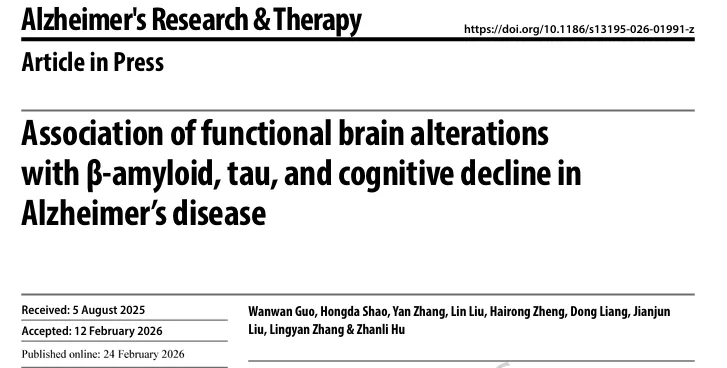 ALZHEIMERS RES THER | 揭示阿爾茨海默病腦功能改變與蛋白病理及認知下降的復(fù)雜關(guān)聯(lián)機制