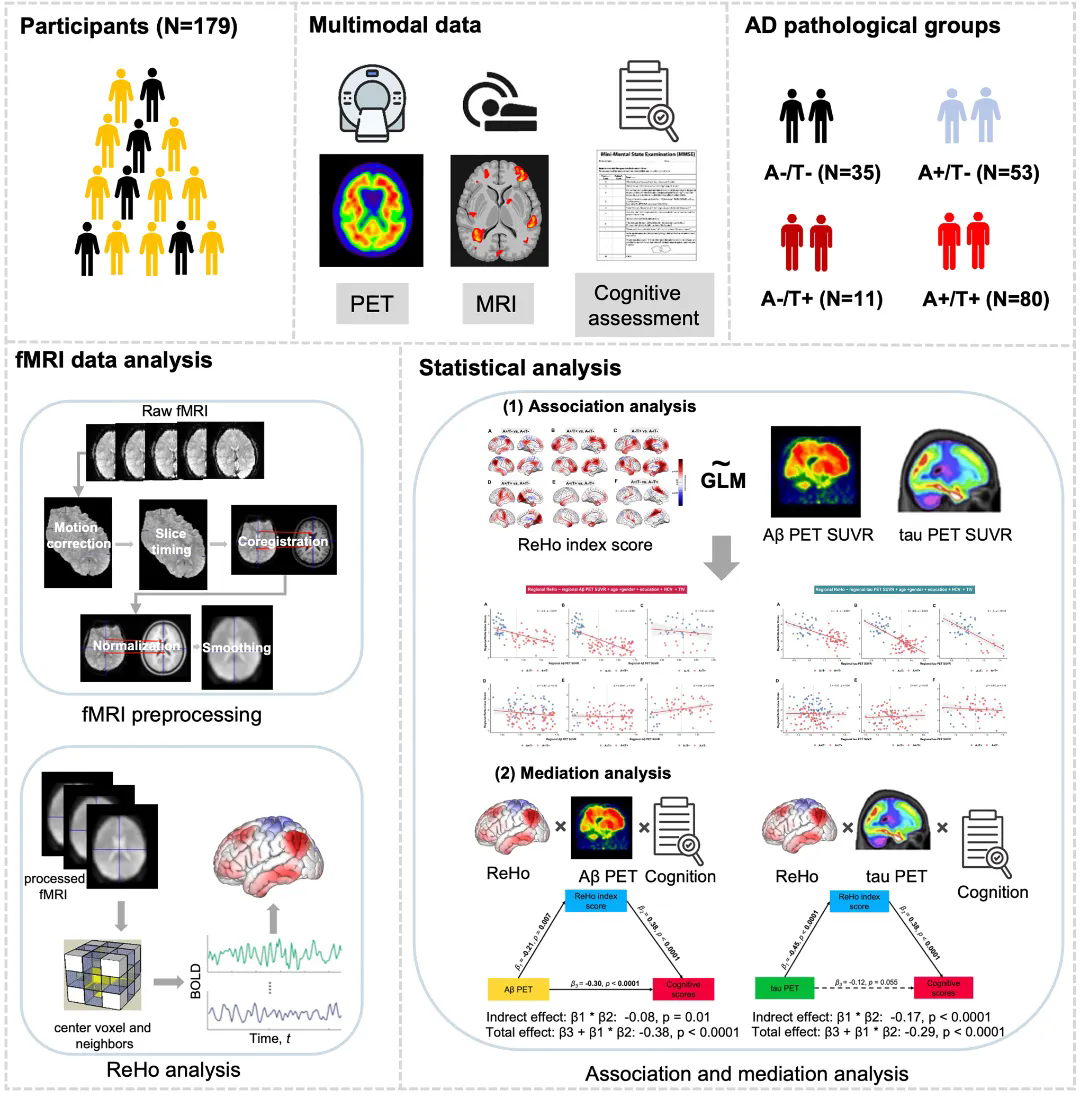 2月,中國科學(xué)院深圳先進技術(shù)研究院(以下簡稱“深圳先進院”)醫(yī)學(xué)成像科學(xué)與技術(shù)系統(tǒng)全國重點實驗室胡戰(zhàn)利研究員,與深圳市龍崗區(qū)中心醫(yī)院醫(yī)學(xué)影像科張靈艷主任團隊、上海交通大學(xué)醫(yī)學(xué)院附屬仁濟醫(yī)院核醫(yī)學(xué)科劉建軍主任團隊合作,在阿爾茨海默?。ˋD)研究領(lǐng)域取得重要進展。研究團隊深入探討了大腦皮層β-淀粉樣蛋白(Aβ)和Tau蛋白聚集,如何通過改變腦功能活動(以局部一致性 ReHo為指標)進而導(dǎo)致AD患者認知下降的內(nèi)在機制,為理解AD病理機制與臨床表型之間的關(guān)聯(lián)提供了新視角。相關(guān)成果以"Association of functional brain alterations with β-amyloid, tau, and cognitive decline in Alzheimer's disease"為題,發(fā)表在阿爾茨海默病領(lǐng)域知名期刊Alzheimer's Research & Therapy(IF=7.6)上。