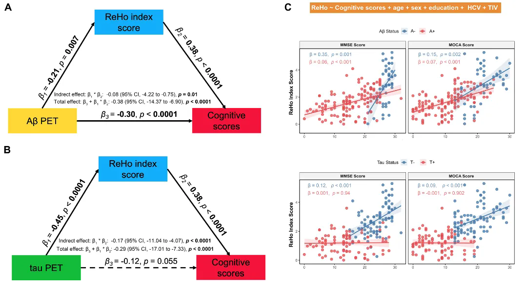 圖3: AD病理、腦功能改變與臨床認知評分之間的中介分析結(jié)果(A, B)及腦功能活動與臨床認知評分之間的關(guān)聯(lián)(C)