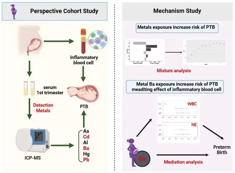 早產(chǎn)作為全球重大公共衛(wèi)生問題,指妊娠37周之前出生的活嬰兒,其不僅是5歲以下兒童死亡的主要危險(xiǎn)因素,還會(huì)使早產(chǎn)兒面臨呼吸疾病、慢性病癥、神經(jīng)系統(tǒng)障礙等長(zhǎng)期健康風(fēng)險(xiǎn)。監(jiān)測(cè)數(shù)據(jù)顯示,2012-2018年早產(chǎn)發(fā)生率年均上升1.3%,2020年全國(guó)早產(chǎn)病例達(dá)75.29萬例,占活產(chǎn)數(shù)的6.1%。隨著工業(yè)化與城市化發(fā)展,環(huán)境金屬污染成為新興健康威脅,已有研究發(fā)現(xiàn)金屬暴露與早產(chǎn)存在關(guān)聯(lián),但二者間的潛在作用機(jī)制尚未明確,孕早期金屬暴露如何導(dǎo)致早產(chǎn)的發(fā)生,成為亟待闡明的關(guān)鍵科學(xué)問題。