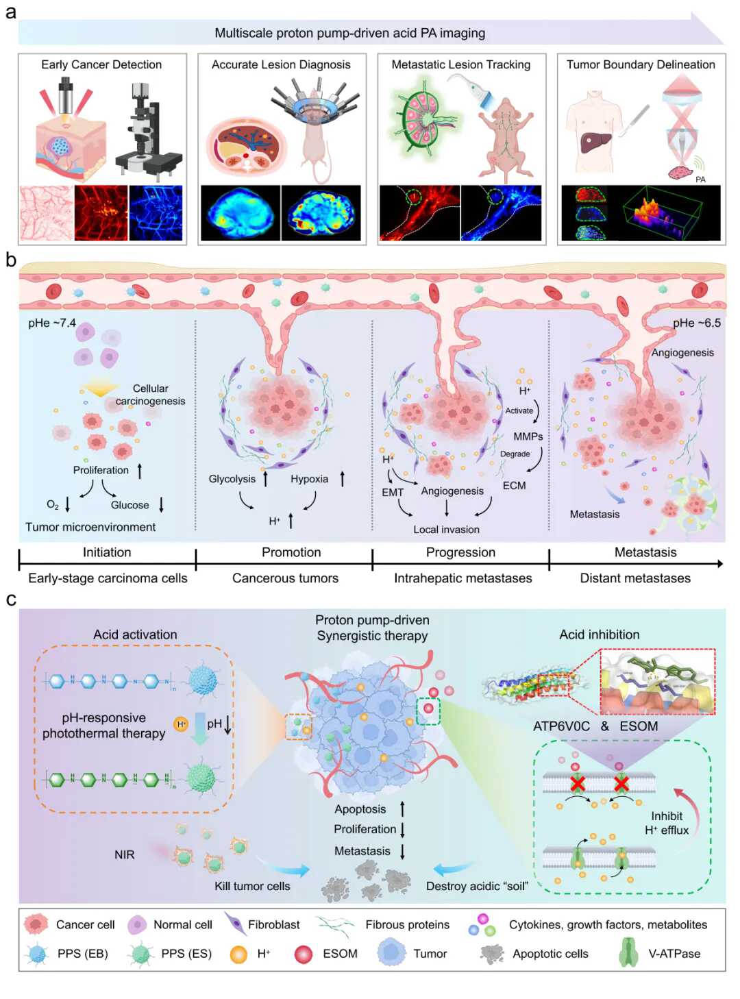 團(tuán)隊(duì)基于自主研發(fā)的多尺度光聲分子成像儀器,實(shí)現(xiàn)了從腫瘤早期微小病灶、到原位實(shí)體瘤增殖、以及腫瘤經(jīng)淋巴向遠(yuǎn)端轉(zhuǎn)移的可視化成像,揭示了酸性微環(huán)境伴隨腫瘤演進(jìn)的空間擴(kuò)張與強(qiáng)度動(dòng)態(tài)變化,在人體離體肝癌樣本中實(shí)現(xiàn)了腫瘤邊界精準(zhǔn)界定。研究進(jìn)一步發(fā)現(xiàn),pH響應(yīng)比率型分子探針在酸性條件下表現(xiàn)出增強(qiáng)的光熱效應(yīng),將其與質(zhì)子泵抑制劑聯(lián)用,可協(xié)同抑制腫瘤生長,展現(xiàn)出良好的腫瘤治療潛力。本研究證明了酸性微環(huán)境在腫瘤惡性進(jìn)展中的關(guān)鍵作用,為基于酸性微環(huán)境的腫瘤早期診斷、進(jìn)展評估提供了成像范式,為基于酸性微環(huán)境的腫瘤靶向治療策略開發(fā)出新工具。