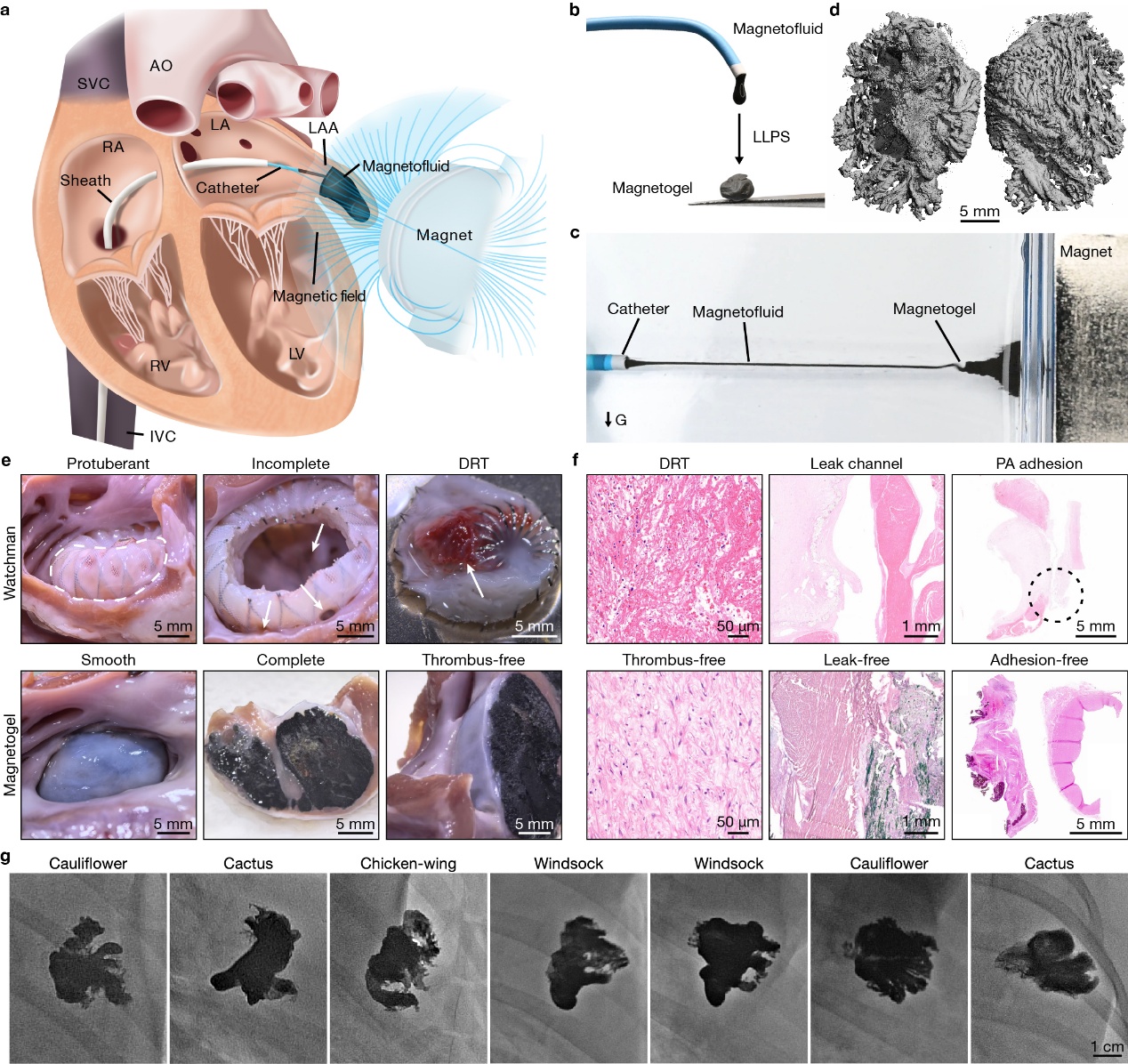 針對(duì)這一臨床難題,北京時(shí)間3月5日,中國科學(xué)院深圳先進(jìn)技術(shù)研究院集成所徐天添團(tuán)隊(duì)聯(lián)合中國醫(yī)學(xué)科學(xué)院阜外醫(yī)院潘湘斌團(tuán)隊(duì),在《自然》發(fā)表最新研究。合作團(tuán)隊(duì)首次研發(fā)出了一種可個(gè)性化適配所有左心耳類型的磁流體機(jī)器人(Magnetofluids),并提出了一種基于液體的心臟左心耳封堵的技術(shù)體系。