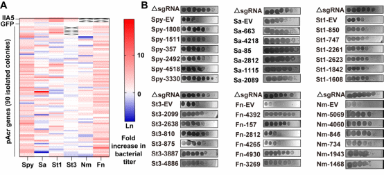 基于上述發(fā)現(xiàn),研究團(tuán)隊(duì)開發(fā)了一套整合大規(guī)模生物信息學(xué)分析與高通量功能篩選的實(shí)驗(yàn)體系,旨在系統(tǒng)性地“捕獲”腸道噬菌體編碼的Acr。他們首先利用CRISPR間隔區(qū)與病毒序列的匹配信息,鎖定了那些正與細(xì)菌進(jìn)行激烈攻防的噬菌體。隨后,結(jié)合“guilt by association”等策略,從33,242個(gè)腸道病毒基因組中篩選出13,493個(gè)候選基因。