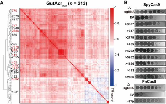 近日,中國科學(xué)院深圳先進(jìn)技術(shù)研究院定量合成生物學(xué)全國重點(diǎn)實(shí)驗(yàn)室、合成微生物組學(xué)研究中心馬迎飛團(tuán)隊(duì)成功從人類腸道噬菌體中,發(fā)現(xiàn)了一大批能夠抑制II型CRISPR系統(tǒng)的Acr,并揭示了一類全新的、結(jié)構(gòu)高度相似卻機(jī)制多樣的抗CRISPR蛋白家族——GutAcraca。相關(guān)研究成果發(fā)表于國際權(quán)威期刊Cell Host & Microbe,為理解腸道微生物互作機(jī)制以及開發(fā)新型基因編輯調(diào)控工具提供了新的視角。
