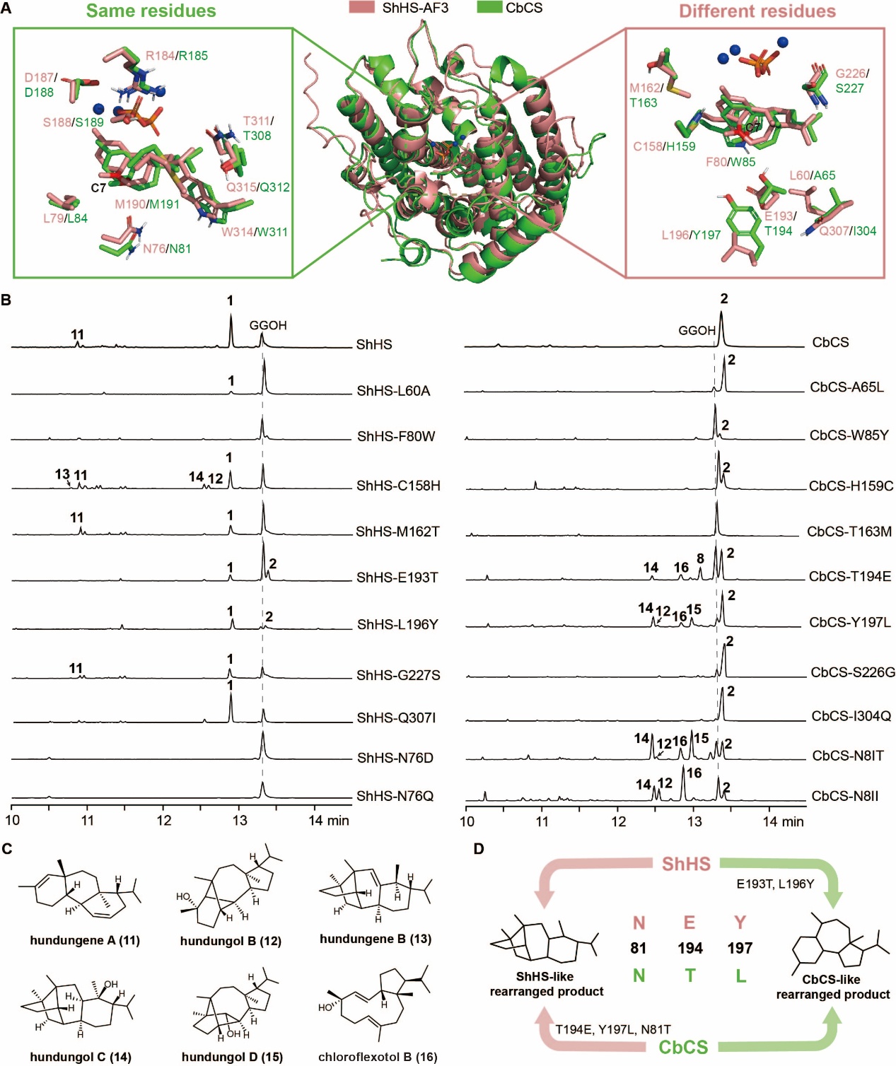 一個(gè)關(guān)鍵問(wèn)題隨之出現(xiàn):是什么決定了CbCS和ShHS兩個(gè)酶在分支點(diǎn)H之后的反應(yīng)方向?為了回答這一問(wèn)題,研究人員成功解析了CbCS的晶體結(jié)構(gòu),同時(shí)借助AlphaFold3完成了ShHS的結(jié)構(gòu)預(yù)測(cè),并將關(guān)鍵中間體H分別對(duì)接至兩個(gè)酶的活性中心開(kāi)展比對(duì)分析。結(jié)構(gòu)分析結(jié)果顯示,中間體H周?chē)灿?7個(gè)潛在參與催化的氨基酸殘基,其中8個(gè)在兩種酶之間存在差異。通過(guò)定點(diǎn)突變實(shí)驗(yàn),研究人員成功實(shí)現(xiàn)了二者的功能互換:在ShHS中引入E193T和L196Y突變,可使其生成CbCS的主要產(chǎn)物;而在CbCS中引入相應(yīng)的反向突變T194E和Y197L,則能產(chǎn)生ShHS的特征產(chǎn)物。此外,位于活性中心附近的關(guān)鍵位點(diǎn)N76/N81對(duì)反應(yīng)路徑同樣具有重要調(diào)控作用。研究團(tuán)隊(duì)進(jìn)一步利用這些突變體,分離鑒定出hundungol C、hundungol D、chloroflexotol B和hundungene C等多種新型二萜化合物,并通過(guò)同位素標(biāo)記實(shí)驗(yàn),驗(yàn)證了這些化合物具有共同的早期環(huán)化過(guò)程,以及后期的1,5-氫遷移機(jī)制。
