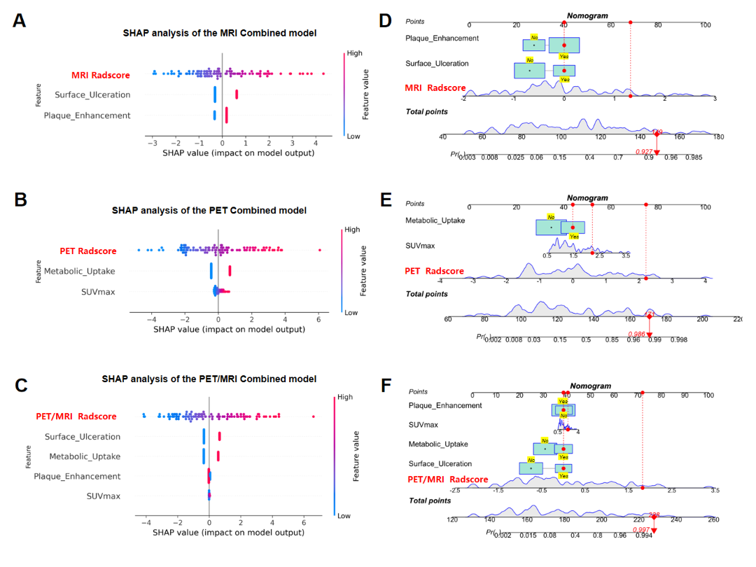 圖2:訓(xùn)練隊(duì)列中MRI、PET及PET/MRI聯(lián)合模型的SHAP分析(A-C)與列線圖(D-F)對(duì)比