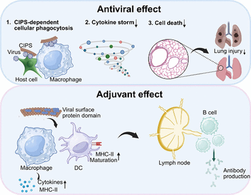 圖1 CIPS通過CIPS依賴性細胞吞噬實現(xiàn)抗病毒與疫苗佐劑雙重功能的工作機制示意圖