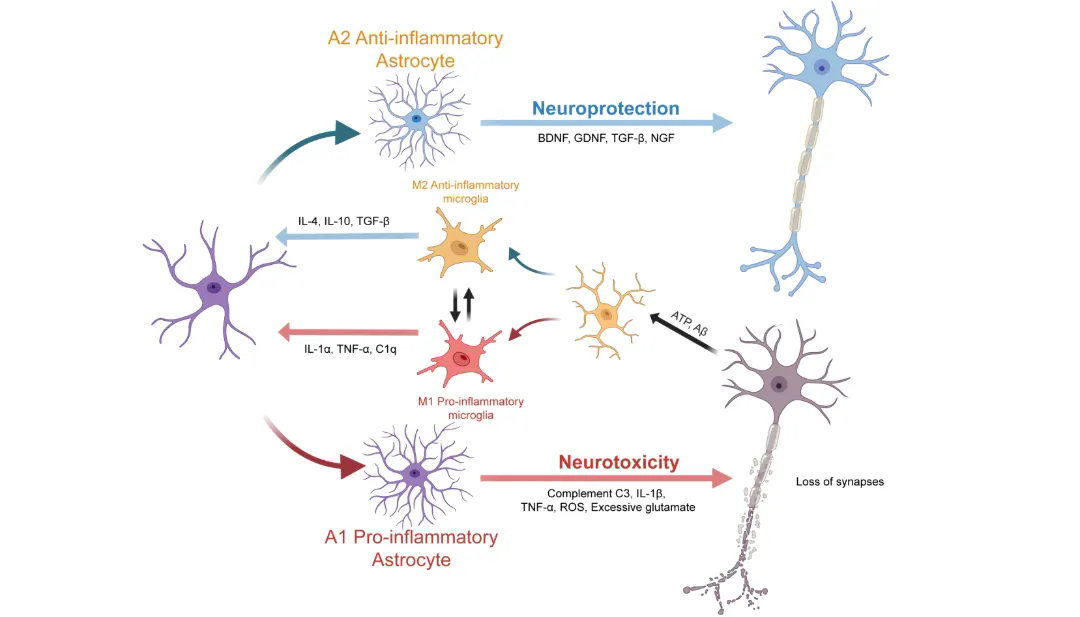 而在疾病狀態(tài)下,膠質(zhì)細(xì)胞并不是被動響應(yīng)損傷,而是會發(fā)生高度動態(tài)的狀態(tài)轉(zhuǎn)變。小膠質(zhì)細(xì)胞可以從穩(wěn)態(tài)監(jiān)視狀態(tài)轉(zhuǎn)向促炎或修復(fù)相關(guān)狀態(tài),星形膠質(zhì)細(xì)胞也可在不同病理背景下轉(zhuǎn)變?yōu)榫哂猩窠?jīng)毒性或神經(jīng)保護(hù)性的反應(yīng)性亞型。正因如此,膠質(zhì)細(xì)胞不再只是疾病“發(fā)生之后”的伴隨反應(yīng)者,而更像是決定病程如何推進(jìn)、損傷如何被放大或限制的關(guān)鍵調(diào)度者。