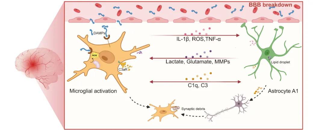 綜述系統(tǒng)梳理了小膠質(zhì)細(xì)胞與星形膠質(zhì)細(xì)胞之間的多重反饋環(huán)路。活化的小膠質(zhì)細(xì)胞可釋放 IL-1α、TNF-α、C1q、ROS 等因子,誘導(dǎo)星形膠質(zhì)細(xì)胞進(jìn)入更具神經(jīng)毒性的反應(yīng)狀態(tài);而反應(yīng)性星形膠質(zhì)細(xì)胞又可通過C3/C3aR軸、代謝產(chǎn)物釋放、谷氨酸失衡以及細(xì)胞外囊泡等方式,反過來維持或強(qiáng)化小膠質(zhì)細(xì)胞的促炎激活。