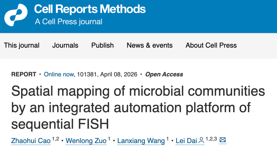2026年4月8日,中國(guó)科學(xué)院深圳先進(jìn)技術(shù)研究院定量合成生物學(xué)全國(guó)重點(diǎn)實(shí)驗(yàn)室、合成生物學(xué)研究所戴磊課題組在Cell Press旗下期刊Cell Reports Methods上發(fā)表研究論文《Spatial mapping of microbial communities by an integrated automation platform of sequential FISH》。團(tuán)隊(duì)在前期開(kāi)發(fā)的SEER-FISH技術(shù)基礎(chǔ)上,進(jìn)一步構(gòu)建了序貫容錯(cuò)熒光原位雜交自動(dòng)化空間成像平臺(tái)SEER-Map。該平臺(tái)可在無(wú)人值守條件下連續(xù)完成40輪雜交成像,同時(shí)依托優(yōu)化的樣品前處理方案,大幅降低了試劑成本,為系統(tǒng)解析微生物群落在微米尺度的空間生物地理分布和物種互作關(guān)系提供了強(qiáng)有力的技術(shù)工具。