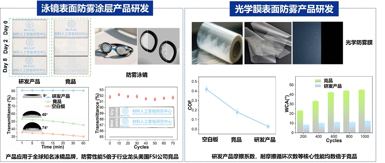 依托上述技術(shù),喻學(xué)鋒、楊帆團(tuán)隊(duì)已快速構(gòu)建從材料設(shè)計(jì)、性能預(yù)測到涂層工藝優(yōu)化的完整智能研發(fā)體系,并形成多項(xiàng)涂層技術(shù)和產(chǎn)品,已獲得10多項(xiàng)發(fā)明專利授權(quán)。相關(guān)技術(shù)已在高端光學(xué)系統(tǒng)、電子設(shè)備界面防護(hù)、精密傳感器件、AR/VR光學(xué)模組、幕墻系統(tǒng)等場景進(jìn)行驗(yàn)證,在復(fù)雜溫濕度環(huán)境下可有效抑制界面凝露對系統(tǒng)性能的影響,提升光學(xué)路徑穩(wěn)定性與長期可靠性。團(tuán)隊(duì)與華凱體育合作,構(gòu)建了面向游泳眼鏡產(chǎn)品的全新光固化涂層技術(shù)體系,成功開發(fā)了百次循環(huán)無霧的先進(jìn)光學(xué)涂層,性能5倍于防霧涂層行業(yè)龍頭美國公司競品,產(chǎn)品已應(yīng)用于全球知名運(yùn)動品牌。