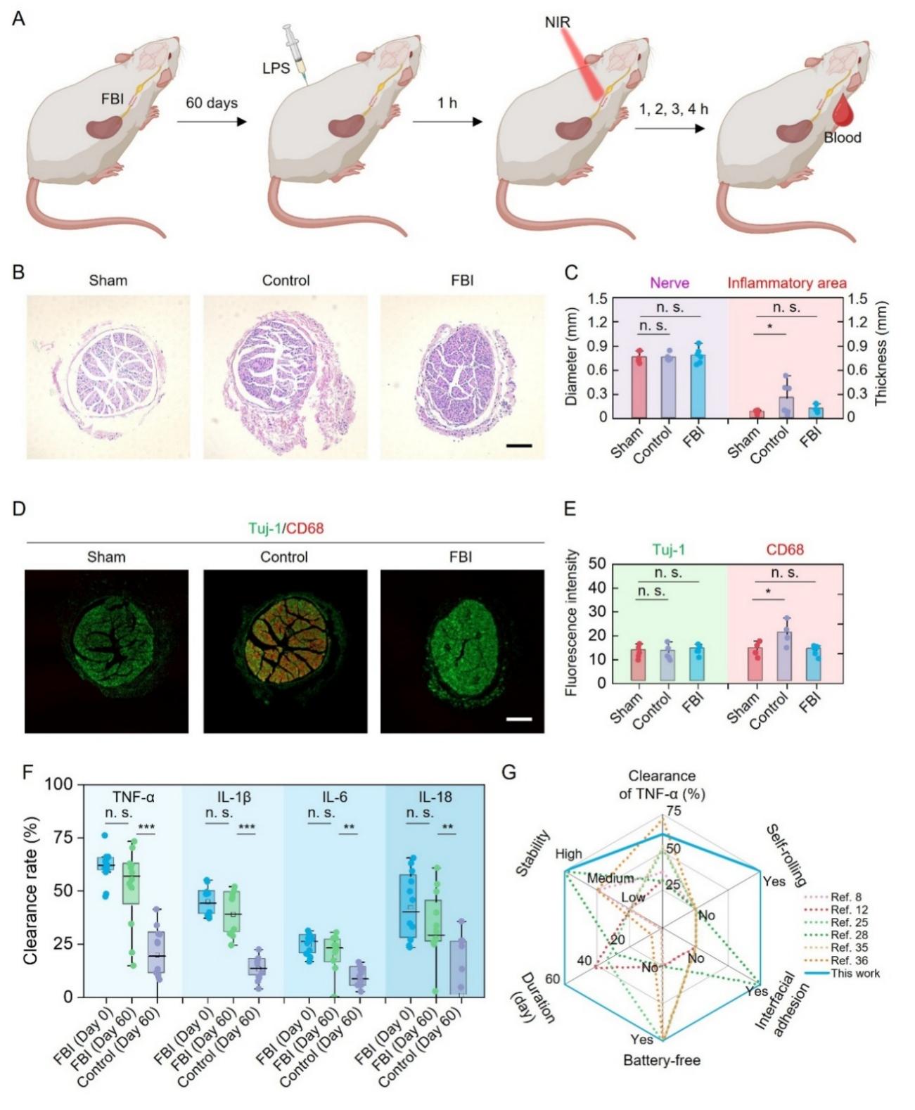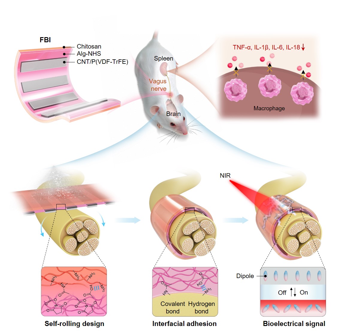 該FBI由三層功能材料協(xié)同整合而成,共同賦予其自卷曲、免縫合和仿生電信號輸出的多重功能(圖1)。其中,底層由具有優(yōu)異生物相容性的殼聚糖和海藻酸鈉天然多糖構(gòu)建的雙層水凝膠基底,在遇水后可自動卷曲成管,精準包裹直徑僅約0.5毫米的細小神經(jīng),實現(xiàn)無縫貼合;與此同時,水凝膠表面的活性基團可與神經(jīng)組織表面形成氫鍵和共價鍵,提供約50千帕的粘附強度,使器件無需縫合即可牢固固定于神經(jīng)表面。位于器件上層的聚偏氟乙烯-三氟乙烯鐵電高分子與碳納米管復(fù)合條帶(CNT/P(VDF-TrFE)),則可在近紅外(NIR)光照射下發(fā)生偶極子取向偏轉(zhuǎn),從而產(chǎn)生與天然神經(jīng)元極化變化所誘導(dǎo)動作電位相似的仿生電信號。基于此,該FBI能夠通過NIR遙控,有效刺激神經(jīng)細胞響應(yīng);與傳統(tǒng)硅基光電材料相比,其誘發(fā)的細胞毒性活性氧水平降低了16倍。在活體實驗中,F(xiàn)BI可自動卷曲包裹大鼠迷走神經(jīng)并實現(xiàn)自粘合,通過激活膽堿能通路進而有效降低血清中促炎細胞因子水平。植入自由活動的大鼠體內(nèi)長達60天后,F(xiàn)BI不僅未出現(xiàn)移位、神經(jīng)壓迫和局部炎癥,而且仍能保持與植入初期一致的抗炎效果。值得強調(diào)的是,F(xiàn)BI通過多功能融合,有效解決了傳統(tǒng)神經(jīng)刺激器與神經(jīng)組織長期存在的界面失配問題,不僅為迷走神經(jīng)刺激治療自身免疫疾病提供了更安全、持久的解決方案,其設(shè)計理念也有望推廣至其他周圍神經(jīng)和中樞神經(jīng)調(diào)控,以及腦機接口、組織工程等多個生物醫(yī)學(xué)領(lǐng)域。