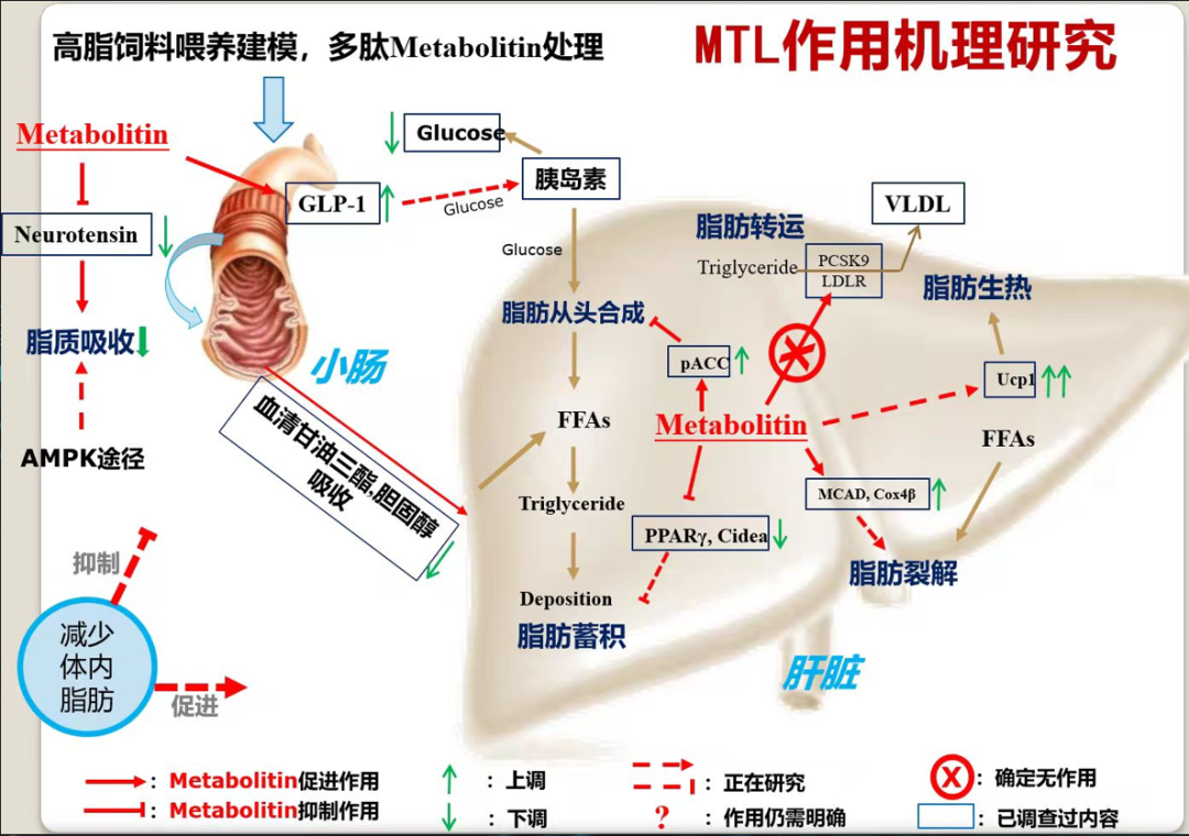 任培根說,在人體腸道中有一層腸絨毛,負(fù)責(zé)食物的吸收。由于演化過程中機(jī)體對(duì)能量的渴望,這層絨毛往往對(duì)營(yíng)養(yǎng)物質(zhì)和脂質(zhì)“照單全收”?!昂?jiǎn)言之,我們的藥物通過抑制一種叫做Neurotensin的腦腸肽,可以關(guān)閉小腸絨毛上吸收脂質(zhì)的通道,對(duì)其他營(yíng)養(yǎng)吸收通道則似乎并無影響,目前可以減少70%左右的脂質(zhì)吸收。而未被吸收的脂質(zhì)可以順著消化道排出,這就是‘節(jié)源’。”實(shí)驗(yàn)設(shè)計(jì)中,小鼠攝入橄欖油并服用多肽藥物,對(duì)比顯示,用藥后的小鼠小腸絨毛吸收脂質(zhì)能力降低數(shù)倍,肝臟脂肪量也顯著降低。他告訴記者,這類藥物所帶來的肝臟等組織器官中的脂質(zhì)燃燒、降低血糖等作用,可以促進(jìn)已經(jīng)在組織、細(xì)胞中的脂質(zhì)離開,從而做到“開流”。