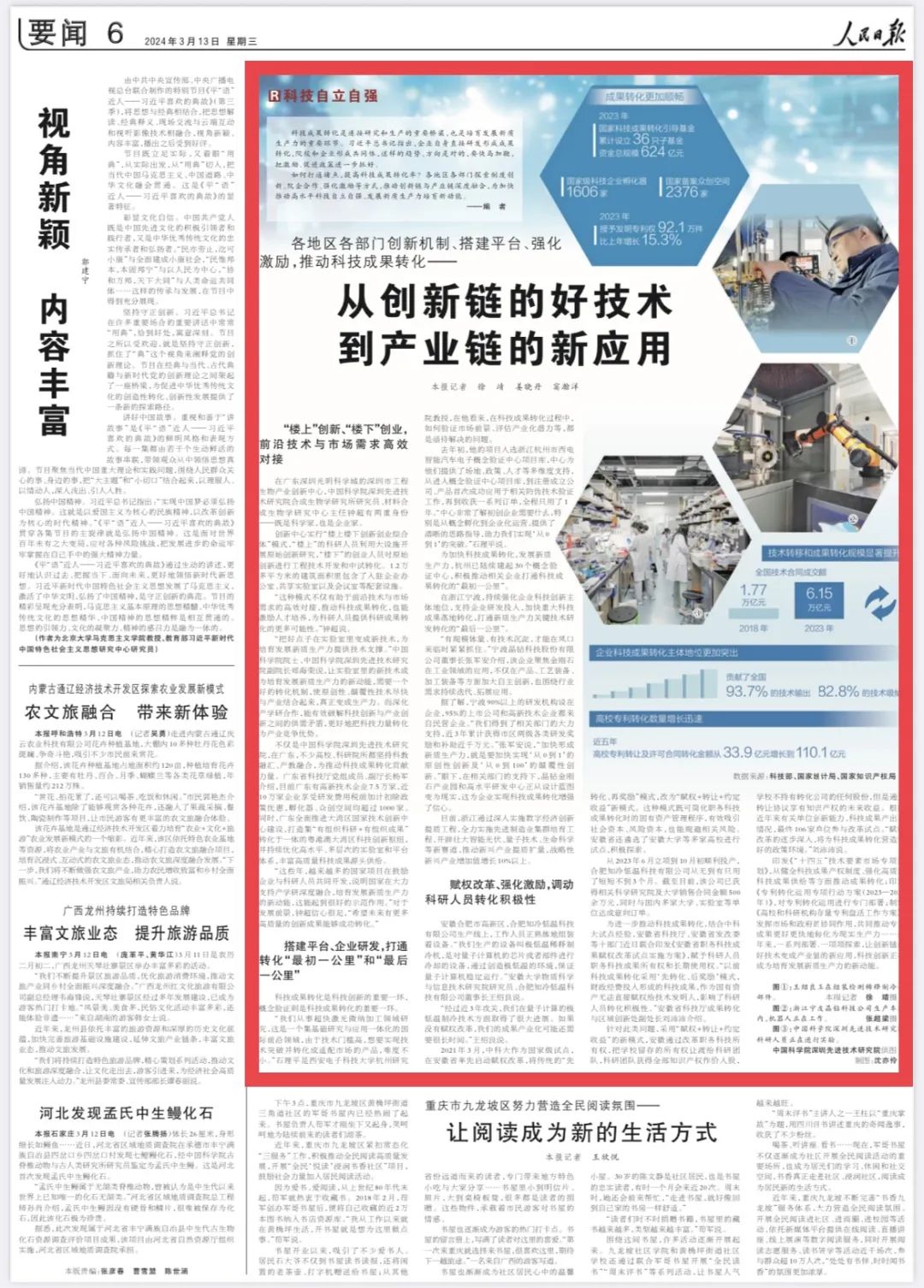 3月13日,《人民日報》的紙質(zhì)版要聞版發(fā)表了題為《各地區(qū)各部門創(chuàng)新機(jī)制、搭建平臺、強(qiáng)化激勵,推動科技成果轉(zhuǎn)化——從創(chuàng)新鏈的好技術(shù)到產(chǎn)業(yè)鏈的新應(yīng)用(科技自立自強(qiáng))》的文章。