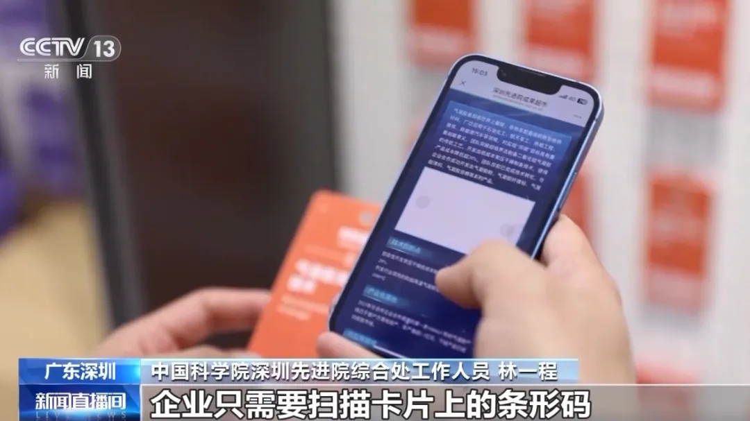 中國科學(xué)院深圳先進(jìn)院綜合處工作人員 林一程:企業(yè)只需要掃描卡片上的條形碼,就能夠在這上面看到他想要的一些技術(shù)成果以及成果完成人的一些信息。如果他對這張卡片感興趣還可以打包帶走,卡片后面還有二維碼,可以通過手機(jī)掃碼識別了解更多的信息。