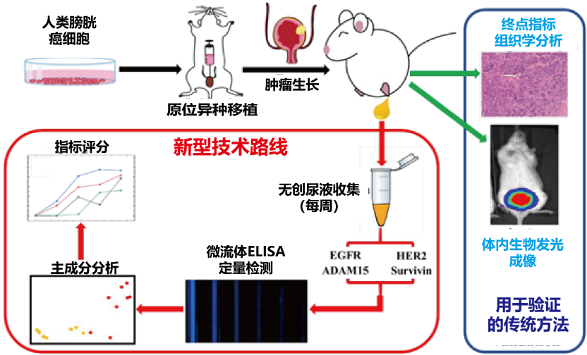 除常規(guī)尿檢之外,近年逐漸發(fā)展的高靈敏生物分子傳感技術(shù),將尿液中的可解讀信息推向一個(gè)新的高度。由于尿液直接來(lái)自于腎臟的代謝,并在膀胱中儲(chǔ)存,其中天然就含有能反饋腎臟及膀胱疾病的核酸、蛋白類生物標(biāo)志物。在我們的前期研究中,曾開(kāi)發(fā)出一種通過(guò)檢測(cè)小鼠尿液中多種膀胱癌相關(guān)蛋白標(biāo)志物,實(shí)現(xiàn)對(duì)膀胱癌原位生長(zhǎng)進(jìn)行實(shí)時(shí)、無(wú)創(chuàng)監(jiān)測(cè)的技術(shù)。它不僅可以有效檢測(cè)膀胱癌的病理進(jìn)程,還能對(duì)腫瘤靶向藥物的治療效果做便捷的觀測(cè),有望在未來(lái)成為一種普惠大眾的腫瘤治療輔助觀測(cè)手段[1]。